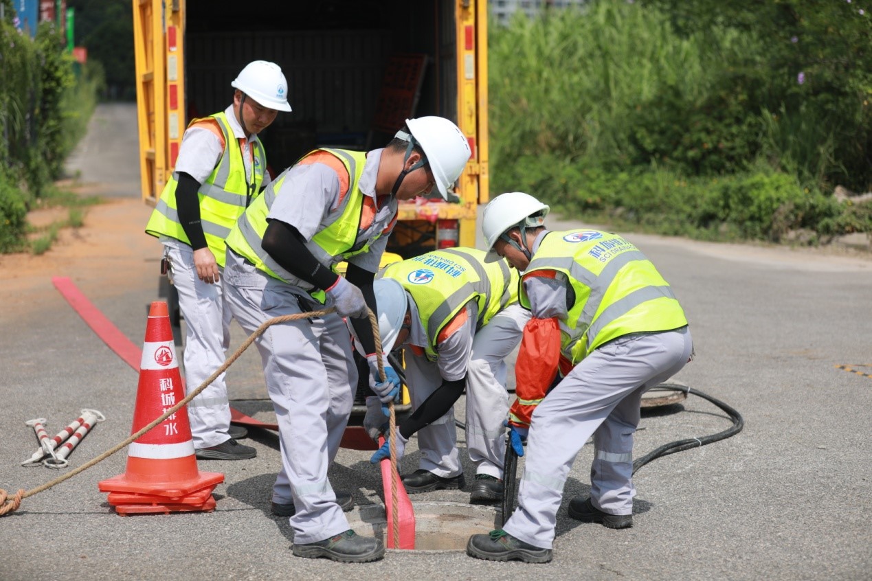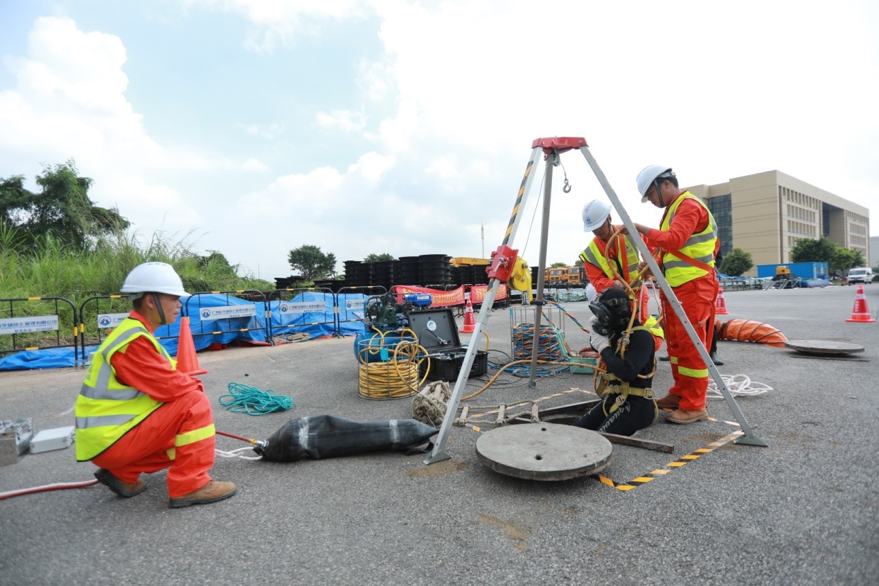 演练现场检阅了汇富娱乐排水公司的清疏养护、抢险抽水等大型设备,以及适用于村居管网养护的小型巡查电动车和小型清疏电动车等。本次演练模拟了暴雨天气突发水浸和有限空间作业突发事故的两个场景,分别开展了布防抢险、有限空间正确操作及突发事故救援演练。针对突发情况,汇富娱乐排水公司迅速启动应急预案,科学指挥调度,各小组人员密切配合开展现场围蔽、安全防护、设备启动、善后处理、救援模拟等一系列行动。