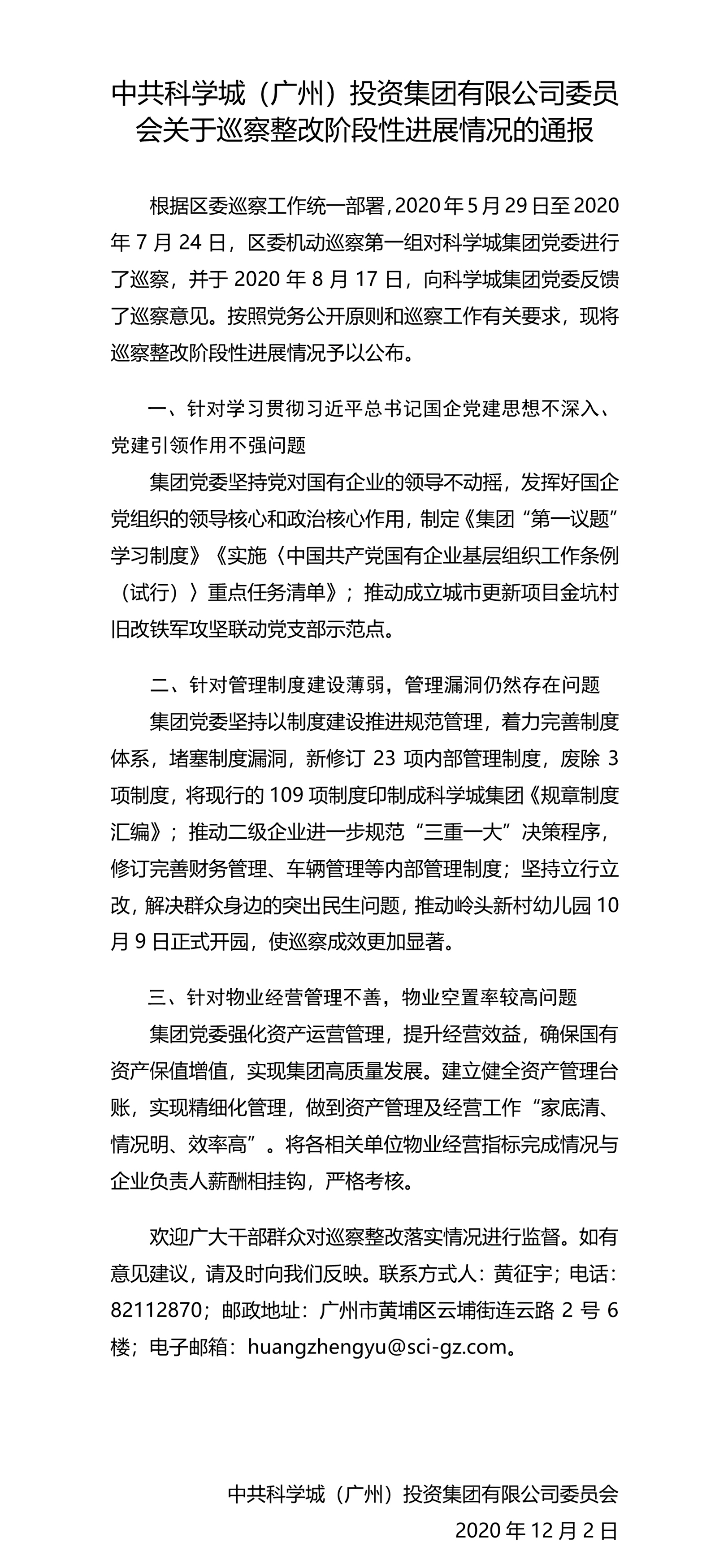 中共汇富娱乐(广州)投资集团有限公司委员会关于巡察整改阶段性进展情况的通报