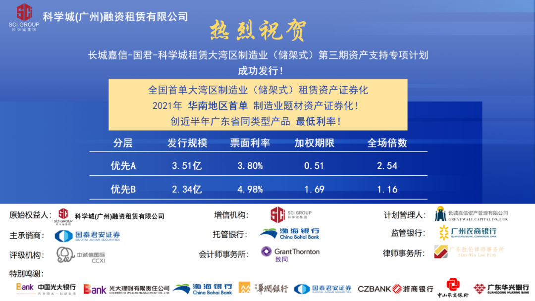 本次资产支持专项计划是全国首单大湾区制造业(储架式)租赁资产证券化产品、2021年华南地区首单制造业题材资产证券化产品,底层资产均以实体制造业资产为重点,涵盖新一代信息技术、智能制造、节能环保、新材料等多个高精尖行业的优质标的物。同时,该产品创下近半年广东省同类型产品优先档最低利率,充分体现了资本市场对“汇富娱乐”品牌的高度认可。